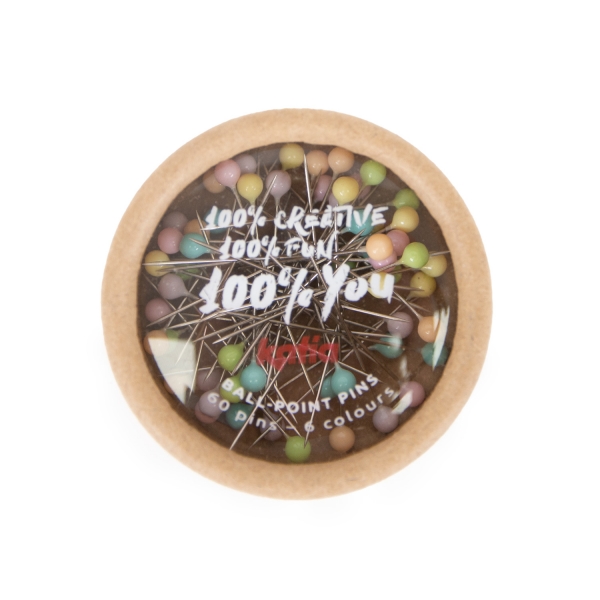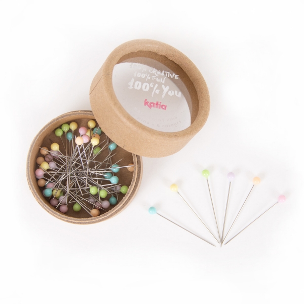 Ponle color a tu costurero con un básico de mercería: alfileres de cabeza redonda de colores. Muy prácticos tanto para fijar piezas de telas en tus proyectos de costura como para bloquear prendas de punto. Su cabeza redonda los hace fáciles de manejar y gracias al acero inoxidable, resultan muy resistentes y duraderos. Dentro de la cajita craft redonda Katia 100% You tienes 60 alfileres de costura en 6 colores pastel (10 unidades por color) a juego con los marcapuntos de nuestra línea de accesorios Katia 100% You. Medidas caja: 6 cm diámetro x 4 cm alto.