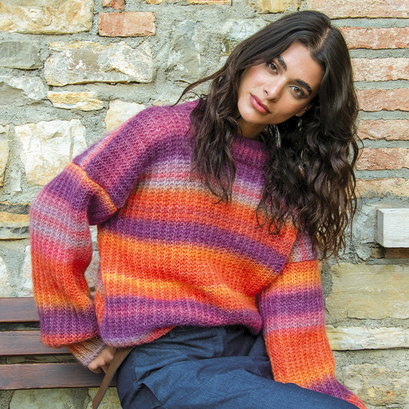 Dolce Mohair es una mezcla de lana con la imprescindible presencia de la fibra de mohair, con una torsión simple, en 2 cabos. Se caracteriza por ser un hilo perchado, ligero y sofisticado: el propio proceso de garzarto que “ rompe” el hilo con la ayuda de unas micro-agujas que sacan parte de la fibra y que crean un efecto de pelo. La presencia del acrílico garantiza una gran estabilidad en el lavado.